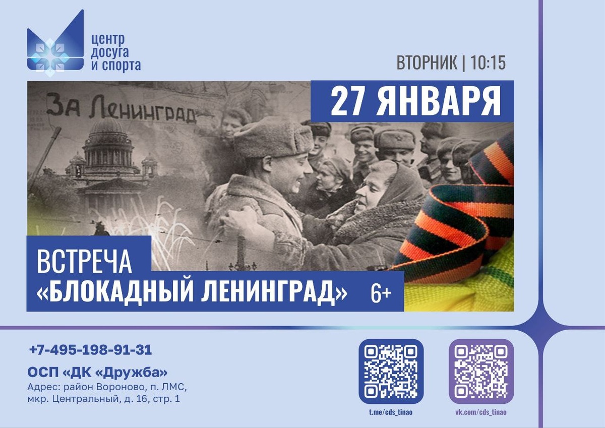 🕯 Приглашаем ребят на важную беседу, посвящённую одной из самых героических и трагических страниц нашей истории — блокаде Ленинграда. Это будет рассказ о великом городе и его жителях, которые сражались до последнего с самым жестоким врагом. Мы поговорим о том, как люди выживали вопреки голоду, холоду, нужде и постоянным налётам фашистской авиации. ⚓️❄ #анонсывороново #анонсытинао #новоститинао
