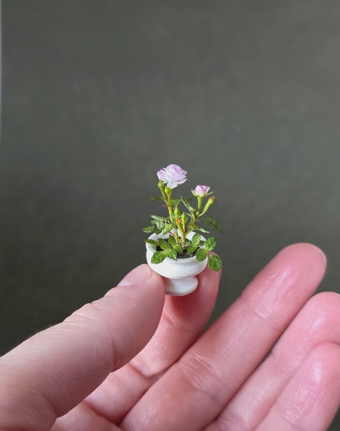 Приветствую всех!) Наконец-то удалось немного отдохнуть от повторов на заказ и сделать что-то по вдохновению, то, что давно хотелось и мечталось!:) Миниатюрная нежно-розовая розочка в белом кашпо. Масштаб 1: 12 Максимально реалистичная для такого размера проработка деталей, если приглядеться хорошенько, можно увидеть крошечные шипы) Тончайшие полупрозрачные лепестки. Цветок выполнен из самотвердевающей флористической глины (холодный фарфор) Тонировка маслом и худож.сухой пастелью. Все веточки гибкие, армированы проволокой. Кашпо изготовлено из глины на гончарном круге. Спасибо за внимание!:) Пост автора OlesyaHandMade. Читать комментарии на Пикабу.