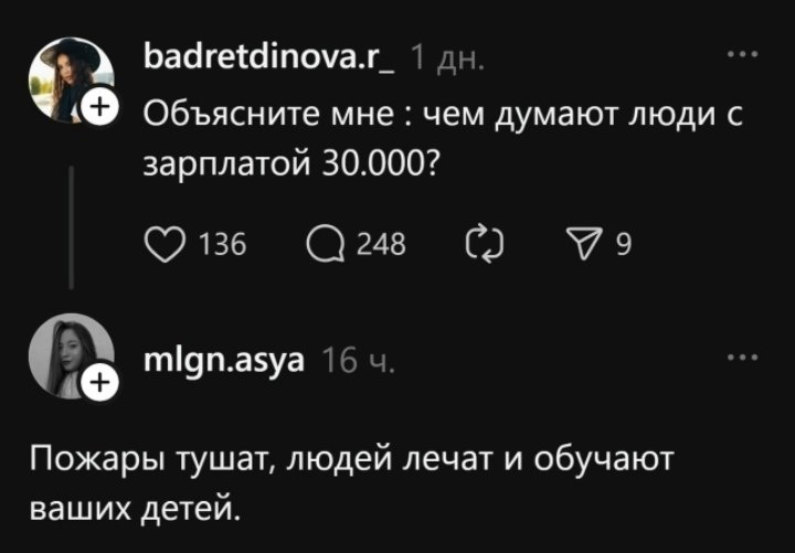 Учат детей читать, считать, думать - тоже 30 тысяч рублей в месяц. Вытаскивают людей из огня и воды - снова 30 тысяч рублей в месяц. А за пару танцев в сториз или «честный» рассказ про утро с кофе - сотни тысяч, миллионы, бренды на рекламу в очередь выстраиваются. Не то чтобы мы против тех же блогеров. Но когда герои в белых халатах, школьных кабинетах и пожарных машинах вынуждены подрабатывать такси или огородом - это не просто несправедливо, это очень унизительно! Это показатель того как капитализм в России оценивает людей творцов, созидателей и спасателей. Что вообще происходит с нами и что не так с нашей страной?🤔 👉 Подписаться на канал