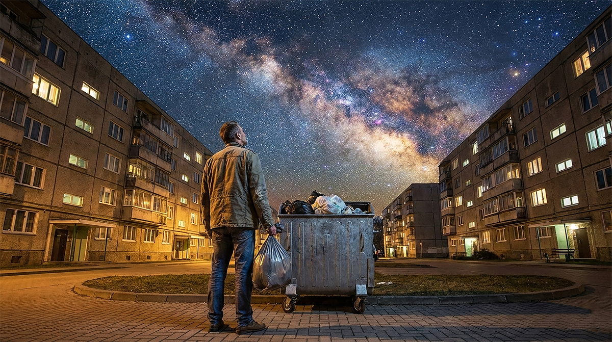 Жил-был один гражданин в самом расцвете сил — сорок два года, возраст, как известно, опасный и располагающий к размышлениям. Жил он, надо сказать, вполне недурно. Имел иномарку, кухню со встроенной техникой и даже дачный участок, на котором периодически произрастал всякий сорняк. Была у него и жена — вполне законная, и дети, которые хулиганили в пределах допустимого износа родительской психики. И вот, знаете ли, приключается с ним этакая духовная канитель. Вроде бы всё, что надо, у человека имеется, а внутри — пустота, как на платной парковке у торгового центра. Катился он по жизни весело, по инерции, и вдруг — стоп, машина. Куда, спрашивается, едем и окупится ли когда-нибудь этот сожжённый бензин? Потянуло его внезапно на всякие интеллектуальные излишества. Стал он в интернете разное научное смотреть. И вот однажды ночью, когда супруга его, Елена, мирно похрапывала в спаленке, засмотрелся он на один видеоролик. Название там было какое-то кучерявое, с претензией: почему, дескать, свет