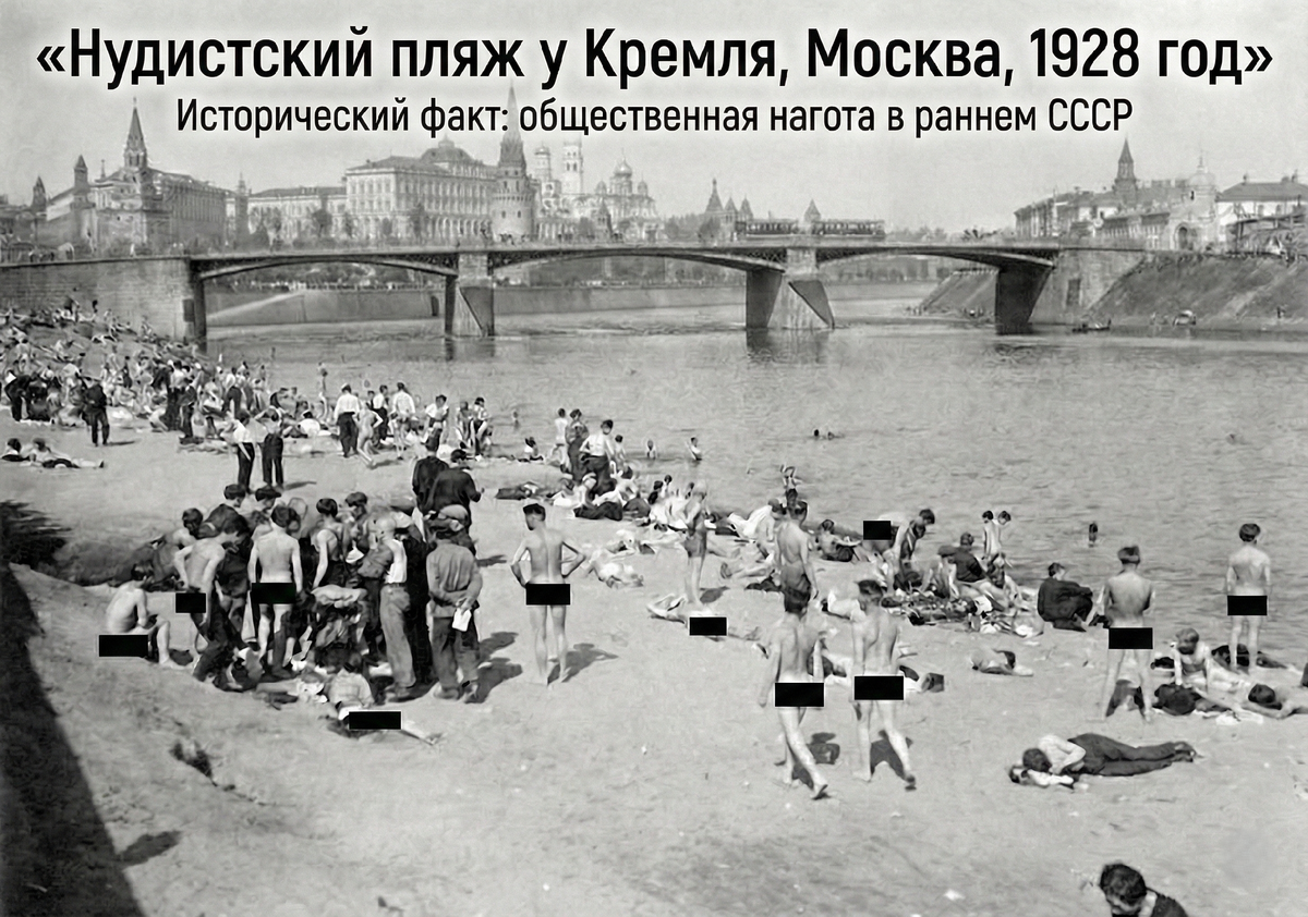 Мы привыкли представлять предков того времени суровыми строителями коммунизма, всегда в пиджаках, кепках и рабочих комбинезонах. Нам кажется, что Советский Союз был страной строгих нравов. Но архивы хранят фотографии, от которых у современного человека округляются глаза. В 1928 году обычный берег Москвы-реки выглядел так, будто туда перенесли немецкий курорт нудистов. И это не было протестом — это было нормой. В 1931 году в Москву приехал знаменитый американский журналист, лауреат Пулитцеровской премии Х.Р. Кникерборкер. Он ожидал увидеть серый тоталитарный строй, а увидел... абсолютно голых людей, играющих в волейбол в центре столицы. Вот как он описывал свой шок: «Тысячи мужчин и женщин, детей и стариков... играют в игры, едят провизию, купаются или принимают воздушные ванны. Большинство — полностью обнажены.Группа юношей соревнуется в прыжках в длину... Все они раздеты. Девушки в легких платьях останавливаются понаблюдать за ними, и никого это не смущает. На другой стороне группа де