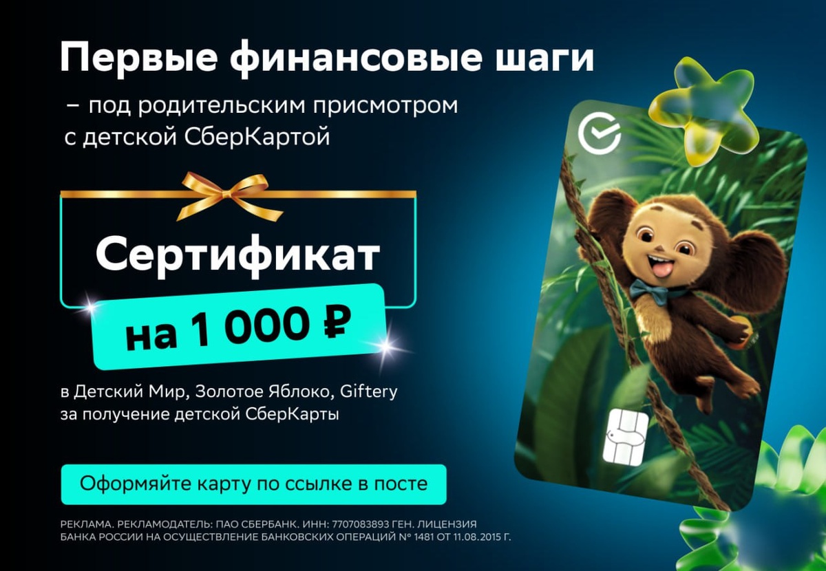 💳#Сбер #Детская #акция ⚡️Можно получить сертификат на 1000₽ в 👏Золотое Яблоко, 👦Детский мир или 🎁Giftery, если по ссылке из этого поста оформить Детскую дебетовую карту Сбера + получить и активировать её не позднее 31.01.26 (совершать покупки необязательно). Правила. • До оформления заявки нужно установить приложение Сбера, туда будет перенаправление с акционной страницы. • Оформить карту может только родитель или законный представитель, у которого есть дебетовая карта Сбера (по сертификату за каждого ребёнка). При получении потребуется свидетельство о рождении. • Указывать нужно номер родителя, который совпадает с номером в банке. • Сертификат придет в SMS на указанный номер в течение 60 дней после получения карты (по вопросам - certificate@perfluence.io). • Прошлая акция завершилась досрочно - фонд ограничен. Карта бесплатна без условий, для детей от 5 лет 11 мес до 14 лет (при наступлении 14 лет, тариф автоматически сменится на Молодёжный). Есть кэшбэк 1% на всё, 1,5% в супер
