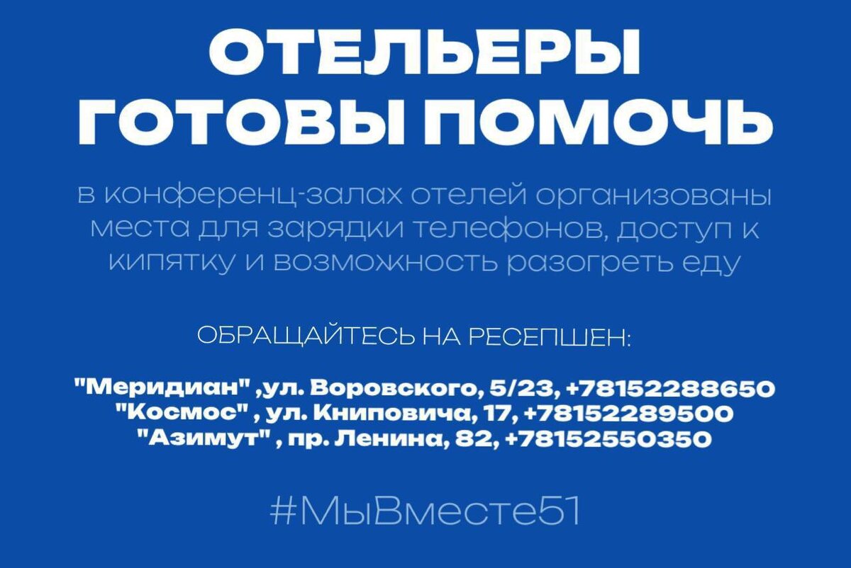 В конференц-залах отелей «Космос» (ул. Книповича, д. 17), «Меридиан» (ул. Воровского, д. 5/23) и «Азимут» (пр. Ленина, д. 82) организованы места для зарядки телефонов, доступ к кипятку и возможность разогреть еду. Чтобы получить помощь, достаточно обратиться на стойку администрации любого из отелей-участников и сообщить о своей ситуации. 🍼 Семьи с маленькими детьми могут обратиться за временным размещением, чтобы искупать ребенка, уложить его спать в тепле и комфорте. О наличии такой возможности нужно заранее уточнить в отеле по телефону: 📞 Космос Мурманск отель +78152289500 📞 Конгресс-отель «Меридиан» +78152288650 📞 Азимут отель Мурманск +78152550350 Кроме того, отели предоставляют скидки на еду в своих ресторанах: ◾️Космос Мурманск отель «Баренц-бар» - скидка 20% ◾️Конгресс-отель «Меридиан» Ресторан «М-клуб» - скидка 25% ◾️Азимут отель Мурманск Кафе Deli (с 14.00) - скидка 20% #МыВместе51