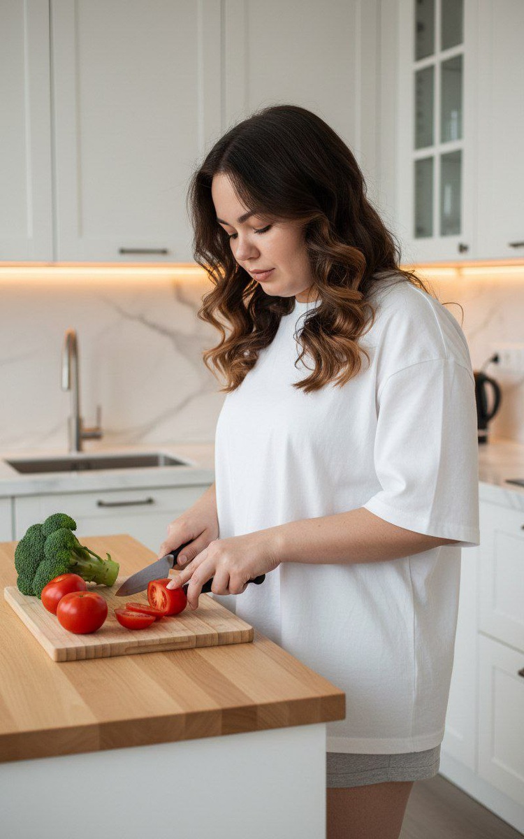 post-processing, focusing on a young woman with caramel-highlighted brunette hair in soft, warm ambient lighting, wearing an oversized white cotton t-shirt and soft gray lounge shorts. Subject positioned off-center at a 45-degree angle, leaning over a light maple wood cutting board, methodically slicing bright crimson tomatoes with a professional-grade chef's knife featuring a matte black handle. Three whole tomatoes and an emerald green broccoli head create vibrant chromatic contrast against neutral kitchen surfaces. Background reveals white cabinetry with subtle panel detailing, underlit by warm amber LED lighting across a marble-like countertop. Stainless steel sink and modern faucet partially visible on composition's left side, subtly reflecting ambient light. Subject's hair styled in loose, voluminous waves cascading over her right shoulder, minimal luminous makeup emphasizing natural beauty. Soft directional lighting creates dimensionality, highlighting subject's sculptural facia