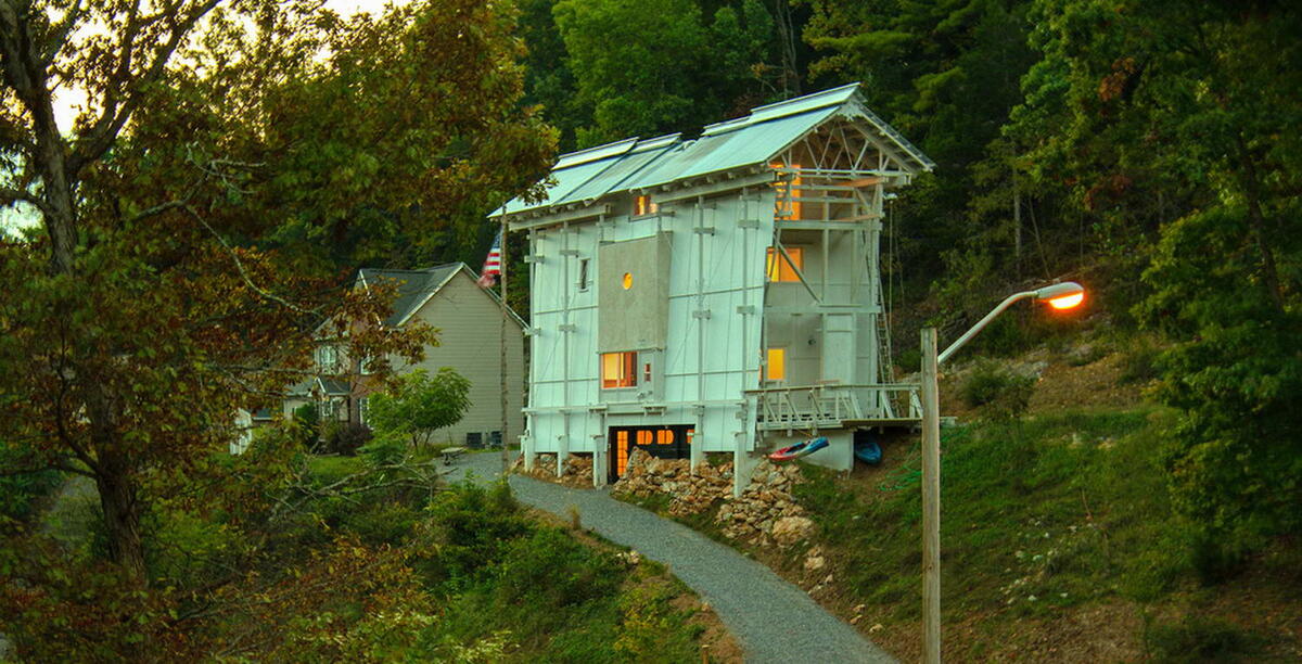 Архитектор Пеннелл спроектировал этот дом как гипотетический проект и вместе с несколькими студентами и одним подрядчиком построил большую его часть самостоятельно, используя простые материалы сложными способами. Дом оснащен таким количеством художественных и механических приспособлений, что невольно возникает вопрос: “Боже мой, кто же, чёрт возьми, построил этот дом? Он выглядит таким строгим, таким внушительным, таким индустриальным! И всё же в нём есть изящество европейского дворцового великолепия! Абстрактная необычность ранних импрессионистов! Величие Аалто или Лооса!» Прямоугольное здание имеет три надземных уровня с частично затопленным подвальным этажом. Камни, выкопанные из фундамента, которые команда подтолкнула как можно ближе к улице, были сложены вокруг основания, чтобы придать ему деревенский вид. Снаружи дом узкий, а его бетонные элементы фундамента выступают из скалистого склона. Большая часть дома обшита фанерой, а сторона, выходящая на улицу, — массивными панелями Ha
