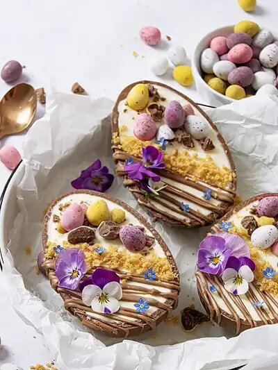 Этот чизкейк в форме пасхального яйца - праздничный десерт, который можно приготовить заранее к Пасхе! Он состоит из маслянистой крошки, кремовой начинки из чизкейка без выпечки и восхитительных шоколадных половинок яиц. Он также украшен милыми мини-яйцами, шоколадной глазурью и цветами, чтобы вы могли в полной мере насладиться Пасхой. Вот рецепт чизкейка. Продукты необходимые для приготовления: