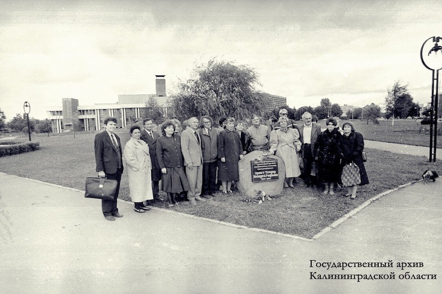 У памятного камня на месте дома, где родился Гофман. 1990 год. Автор А. Бахтин. ГАКО Но идея увековечения памяти Гофмана в Калининграде все же витала в воздухе. 12 сентября 1990 года рядом с городскими часами «Древо времени», больше известными как просто Мировые часы на улице Шевченко, был установлен памятный знак в честь Гофмана. Об этом сообщал краевед Алексей Губин на страницах газеты «Калининградский комсомолец».