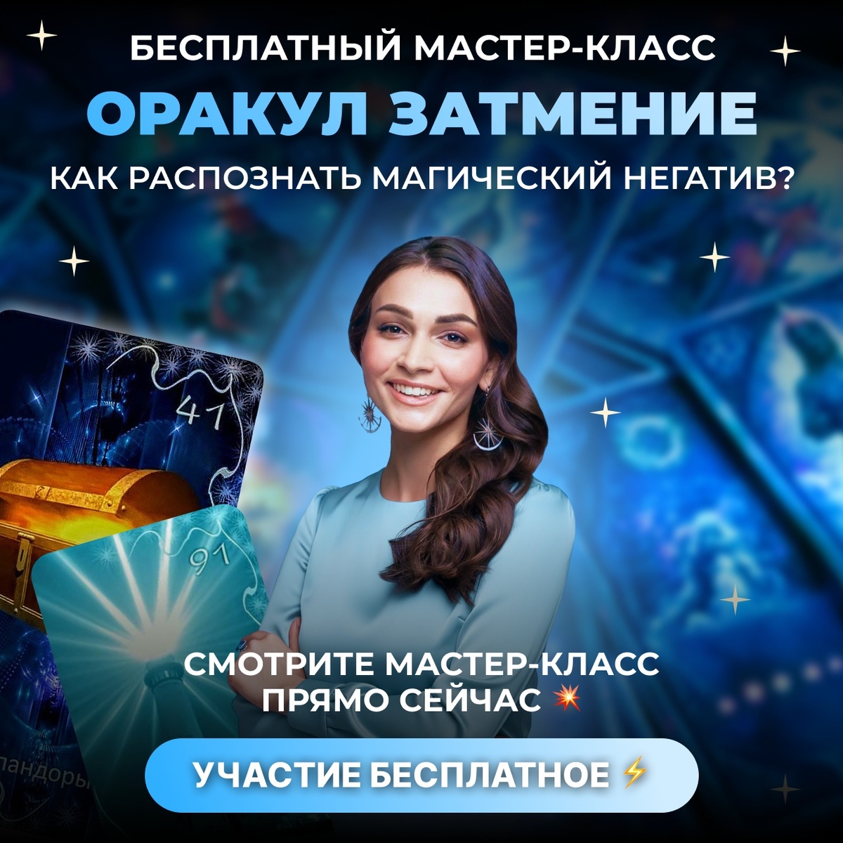 Оракул Затмение – уникальная и говорящая колода, которая буквально показывает то, что скрыто от нас и попадает в самый корень вопроса. И если вы хотите выйти на новый уровень в своей практике – приглашаю вас на мой бесплатный мастер-класс 🌒 ОРАКУЛ ЗАТМЕНИЕ. КАК РАСПОЗНАТЬ МАГИЧЕСКИЙ НЕГАТИВ? Этот мастер-класс для тех, кто устал от поверхностных раскладов и хочет работать глубже🔥 Эта колода позволит вам видеть реальные причины проблем и скрытые факторы, которые влияют на жизнь человека. 😍 Благодаря этому мастер-классу вы получите четкое понимание, как работать с Оракулом Затмение для точной диагностики! И сможете давать ответы клиентам там, где другие бессильны. Изучив эту колоду, вы сможете расширить свой перечень услуг, благодаря освоению нового инструмента! ➡️ И, как следствие, больше зарабатывать, потому что диагностика стоит 3.000-5.000₽! ⚡️ ВАЖНО: после регистрации мастер-класс будет доступен к просмотру в течение 24 часов! Хочу на мастер-класс Хочу на мастер-класс Хочу на маст
