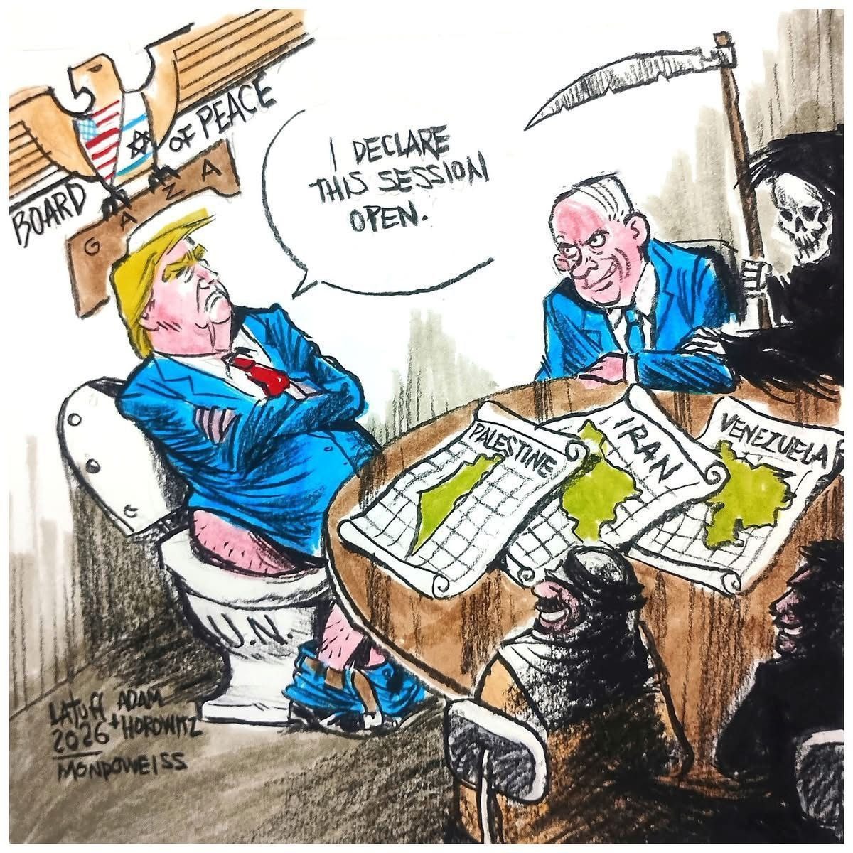 ◾Политический карикатурист Гилберт Латуфф изобразил "Совет мира" Дональда Трампа как инструмент оси США-Израиль, который жертвует правами палестинцев и подрывает международное право, с единственной целью вести войну против трех изображённых стран, а не стремиться к подлинному миру.