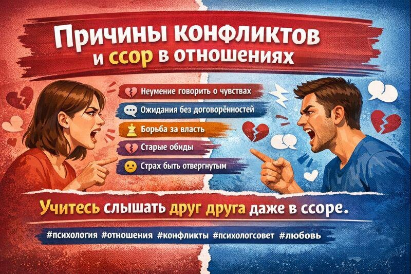 Конфликты — это не признак «плохих» отношений. Чаще всего это сигнал, что между вами есть что-то неуслышанное, непрожитое, недосказанное. Вот ключевые причины, из-за которых пары снова и снова заходят в ссоры 👇 1. Неумение говорить о своих чувствах Мы говорим что не так, но не говорим что чувствуем. Вместо «мне больно» — «ты всегда…». Вместо уязвимости — обвинение. 2. Ожидания без договорённостей «Он/она должен был догадаться». Но партнёр — не телепат. Невысказанные ожидания почти всегда превращаются в претензии. 3. Борьба за власть Кто прав, кто главный, чьё слово решающее. Отношения превращаются в поле боя, а не в пространство поддержки. 4. Старые обиды, которые не прожиты Прошлое не уходит само. Если боль не проговорена и не принята — она всплывает в каждом новом конфликте. 5. Страх быть отвергнутым Парадоксально, но многие ссоры — это крик: «Увидь меня», «Не бросай», «Я важен». Только звучит он через агрессию и холод. 6. Разные языки любви Один показывает любовь делами, дру