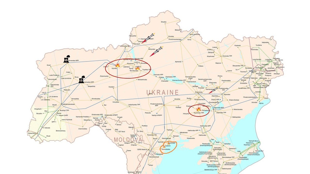 Киевская подстанция 750 КВт и ТЭЦ-5. И Криворожская ТЭС (бордово-коричневые овалы) ПС"Киевская" - это распределение электроэнергии от АЭС для Киева, а Зеленодольская (Криворожская ТЭС третья в своем классе по мощности на Украине) генерация. И закругляя тему ночных ударов. Хохло ПВО как обычно сбило почти все, а что не сбило отклонило магическими лучами. По их данным из 21 ракеты в цель попало всего два гиперзвуковых "Циркона" и какие то жалкие 18 БпЛА из 375. А вот куяне, черниговцы и криворожцы другого мнения, у них совсем не такие цифры-)) Сальное Дифлопэ