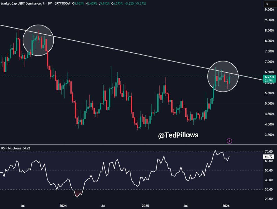 Рынку это не понравится На графике доминации USDT сейчас происходит важный момент, который многие игнорируют. USDT.D подходит к нисходящей трендовой, от которой рынок уже дважды получал откат. И каждый раз сценарий был одинаковый: рост доминации стейблкоинов → давление на BTC и альты → коррекция или боковик. Что мы видим сейчас: — Цена упёрлась в долгосрочное сопротивление — RSI на недельке держится в зоне силы, без явной дивергенции — Структура всё больше напоминает попытку выхода из даунтренда, а не просто локальный всплеск Что это значит? Рост USDT.D — это не «деньги заходят в рынок». Это деньги, которые выходят из риска и паркуются в ожидании. Если доминация закрепляется выше трендовой: — BTC теряет импульс, даже без резкого обвала — Альты чувствуют это первыми и сильнее — Начинается фаза сжатия, выбивания слабых рук и охлаждения эйфории Важно: Это не сигнал «всё продавать». Это сигнал быть внимательнее к рискам, плечам и ожиданиям быстрых иксов. Рынок редко даёт рост без па