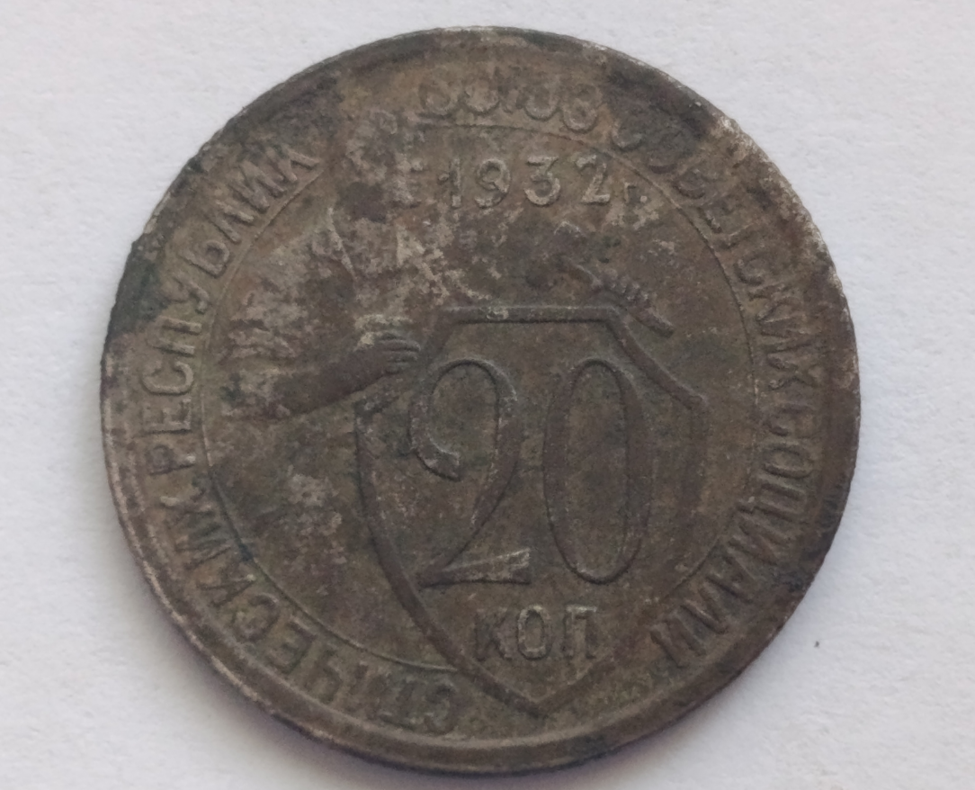 Если внимательно посмотреть вот на эту монетку, то можно увидеть, что среди "черноты" еще различимы признаки жизни - фрагменты первоначального "медно-никелевого" (серебристого) цвета: Монетка хоть и "земляная", но она так удачно залегала, что не успела стать черно-красной. Вполне возможно, что она находилась между двух монет. Сама по себе монета 20 копеек 1932 года является очень массовой, но она имеет хорошие перспективы в чистке, хотя к первоначальному состоянию её вряд ли можно вернуть. Для чистки я использую стандартный способ - кислую среду (лимонку) и щётку. А еще нужно некоторое время. Без всякой спешки у меня ушло 3 дня (и 3 ночи). На выходе получился вот такой результат: Другого результат, наверное, сложно было бы добиться. Стоимость монеты в нормальном состоянии (VF) - сегодня составляет 150-250 рублей. Данная монета, скорее всего, ничего не стоит, так как является результатом эксперимента по чистке. Можно посмотреть на наличие редких разновидностей, которые можно различи