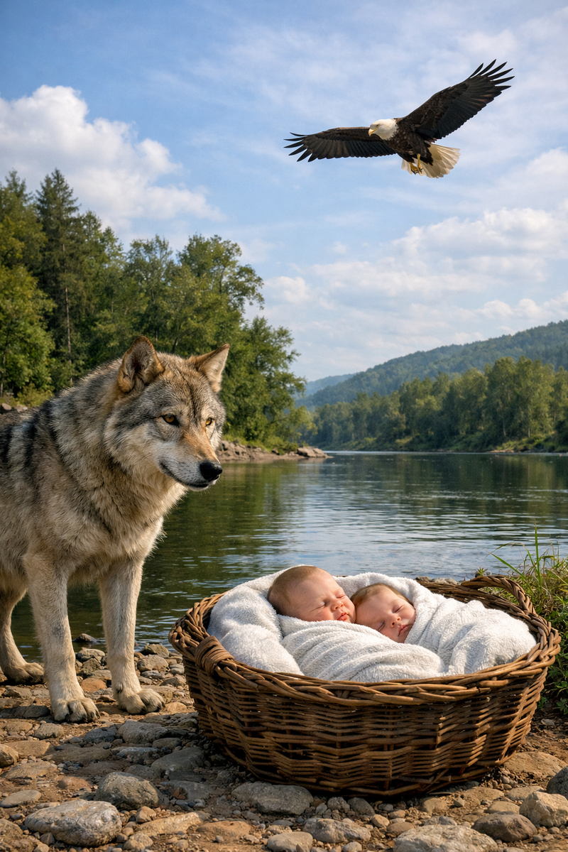 Троянец Эней, сын богини Афродиты и смертного Анхиза, уцелел при разрушении Трои и вместе со своим сыном Аксанием сбежал. После долгих лет странствований он прибыл к берегами Лация. В эти годы там правил Латин, царь местных племён. Он дружески принял Энея и выдал за него свою дочь Лавинию. Спустя годы Эней умер, а его с Лавинией сын основал город Альба Лонга и стал править в нём. Через несколько поколений к власти в Альбе Лонге пришёл Нумитор, которому было не суждено править долго. Его младший брат сверг Нумитора и стал править за него, а дочь Нумитора Рею Сильвию отдал в весталки (жрицы Богини Весты, которые давали обед безбрачия. Однако Рея Сильвия, от Бога Марса, спустя некоторое время родила двух мальчиков. Амулий (тот самый младший брат) был в гневе и приговорил её к смертной казни, а младенцев приказал утопить в бурных водах Тибра. Но сама судьба сжалилась над ними и воды реки были спокойны, когда рабы принесли младенцев к её глади, а затем и вовсе отступили, оставил младенцев н
