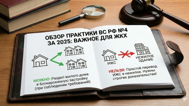 Продолжаем вчитываться в свежий Обзор практики от Верховного суда №4 за 2025. Ищем полезное для ЖКХ, находим: 1. Верховный суд подтвердил, что можно превратить дом в блокированную застройку. Так и сказано: "Законом допускается раздел жилого дома с образованием объектов блокированной застройки при соблюдении требований градостроительного и земельного законодательства." 2. Нельзя просто так взять и перевести ИЖС в нежилое здание. Этим пользовались нехорошие товарищи. К ИЖС нет специальных строгих требований. Строишь ИЖС, а потом переводишь в нежилое здание, к которому требования есть. Например, для здания нужно разрешение на строительство, а для ИЖС - нет. Вот суд и указал: "При предъявлении требования к уполномоченному органу о согласовании перевода индивидуального жилого дома в нежилое здание заявитель должен указать цель его дальнейшего использования и представить доказательства соответствия объекта требованиям законодательства в зависимости от предполагаемого назначения." Подписывай