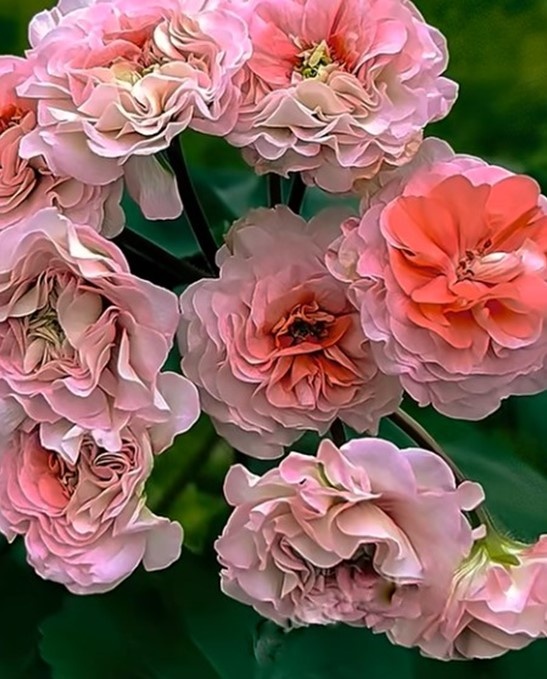 Все эти семь новинок - это гибридные сорта, которые отличаются разнообразием окраски, формы цветков и особенностей роста. У них есть также и общие черты, связанные с принадлежностью к группе зональных и зонартиковых пеларгоний, но каждый сорт имеет свои уникальные характеристики. Собрала здесь те, что мне очень нравятся, именно своими рюшечками, цвет которых отличается от основного фона. У каждой из пеларгоний это делает цветы очень эффектными и как бы объёмными. В моей коллекции есть пока только один из этих семи прекраснейших пеларгоний - зонартиковый гибрид ЮВ Феникс. 1. Эрик Дракон и Розы. Пеларгония – зональный стандарт, результат китайской селекции, которая как дракон, который прячет сокровища в глубине своих лепестков. Хотите узнать секрет? Присмотритесь к нему получше. Цветёт пеларгония крупными лососево-персиковыми густо-махровыми цветками Сорт обильно цветущий, украшенный ярким зеленым глазком. Кустик аккуратный, легко формируется, зацветает даже с черенка. Обильное и прод
