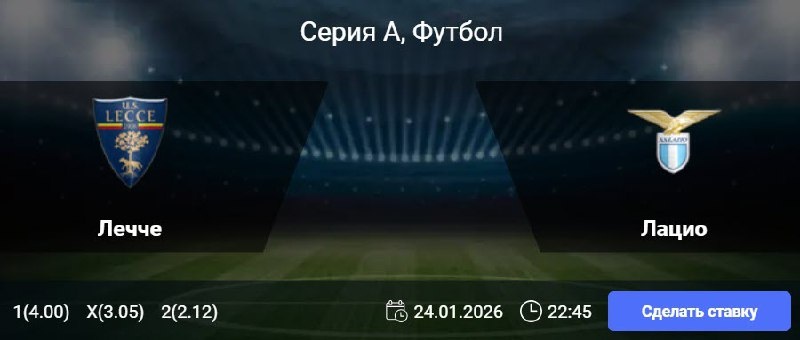 Статистика Лечче: Статистика выступлений «Лечче» на домашней арене также не внушает оптимизма: в последних 11 матчах Серии А одержана лишь одна победа при шести поражениях. В шести из восьми предыдущих домашних игр как минимум одна из команд уходила с поля без гола. Кроме того, в семи из восьми последних поединков на своем поле «Лечче» не удавалось забить больше одного мяча. Статистика Лацио: Несмотря на последние неудачи, на выезде «Лацио» выступает относительно стабильно, избежав поражений в шести из восьми предыдущих гостевых встреч Серии А, где было одержано три победы. Примечательно, что в девяти из десяти последних выездных игр римлян как минимум одна из команд не забивала. Также в семи последних гостевых матчах «Лацио» в чемпионате было зафиксировано не более двух голов. 🎯 X2 и ТМ (2.5) 🎲 кф (1.73) 👉 СДЕЛАТЬ СТАВКУ 🎁 ФРИБЕТ WINLINE - 3000₽ (промокод: BETWIN) 👉 СМОТРЕТЬ ПРОГНОЗ 👇 Подпишись на нас 🧿 ВКонтакте ✈️ Телеграм 📎 Сайт