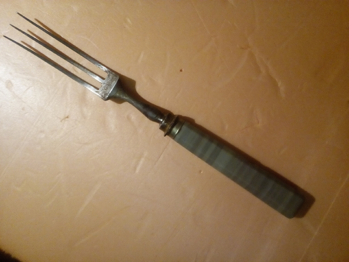 Ручки у двух из офиокальцита, у третьей - амазонит... Первая (имхо) - конец 18 века, вторая - третья четверть 19 в (не точно), третья точно 1830 г. Какое-то клеймо непонятное... И я только сегодня догадался: Это может быть ввозная проба. А вилка - Иран. Из фруктового набора.