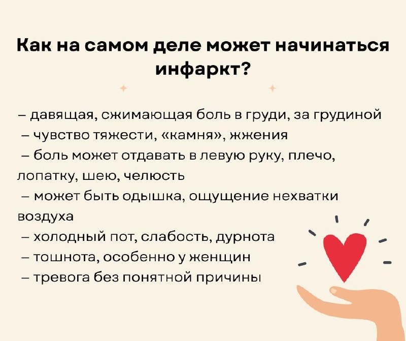Недавно был пациент из практики. Он приехал ко мне через весь город с болями в груди. Не падал, не потерял сознание, не хватался за сердце. Просто несколько часов болело. Боль появилась в покое, не зависела от движения или положения тела. Привычные лекарства не помогли. Мы сделали ЭКГ прямо на приёме. На плёнке — подъём сегмента ST. Картина абсолютно типичная. Диагноз был ясен сразу: острый инфаркт миокарда. Дальше уже не было разговоров — экстренная госпитализация туда, где можно срочно восстановить кровоток в сердце. Почему инфаркт часто пропускают? Потому что он не всегда начинается резко и драматично, как в кино. Многие люди переносят начало инфаркта «на ногах» — едут, идут, терпят, ждут, пьют таблетки. А время в этот момент работает против сердца. Пожалуйста, сохраните этот пост и отправьте себе на стену! Иногда такие знания действительно спасают жизнь — свою или близкого человека.