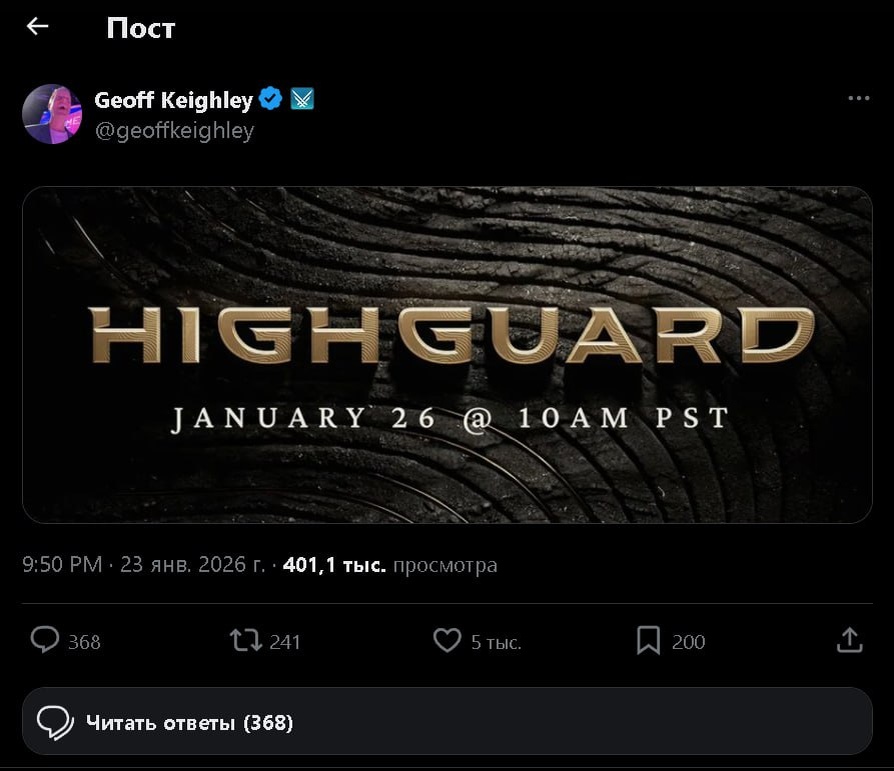 Highguard впервые поделится какими-то новостями за всё это время, но есть нюанс Это произойдёт в день релиза, и они проведут специальную презентацию, где покажут геймплей и поделятся деталями по поддержке игры. Забавно, но Том Хендерсон, отвечая на предположения бывшего репортёра IGN о том, что никто из них не писал про слитые достижения игры, заявил, что большинство редакций и СМИ находятся под NDA касательно Highguard. Это вам не "случайно" слитые рецензии Silent Hill f сразу от пары игрожуров. А Джефф Килли не даст нам забыть об этой игре и напоминает, что Highguard выходит 26 января. 🎮 Crunch'N'Play 🎮