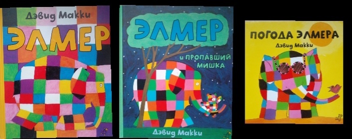 Знакомство наше началось с трех замечательных книг: ' Элмер", " Элмер и пропавший мишка" и книжки - картонки "Погода Элмера".