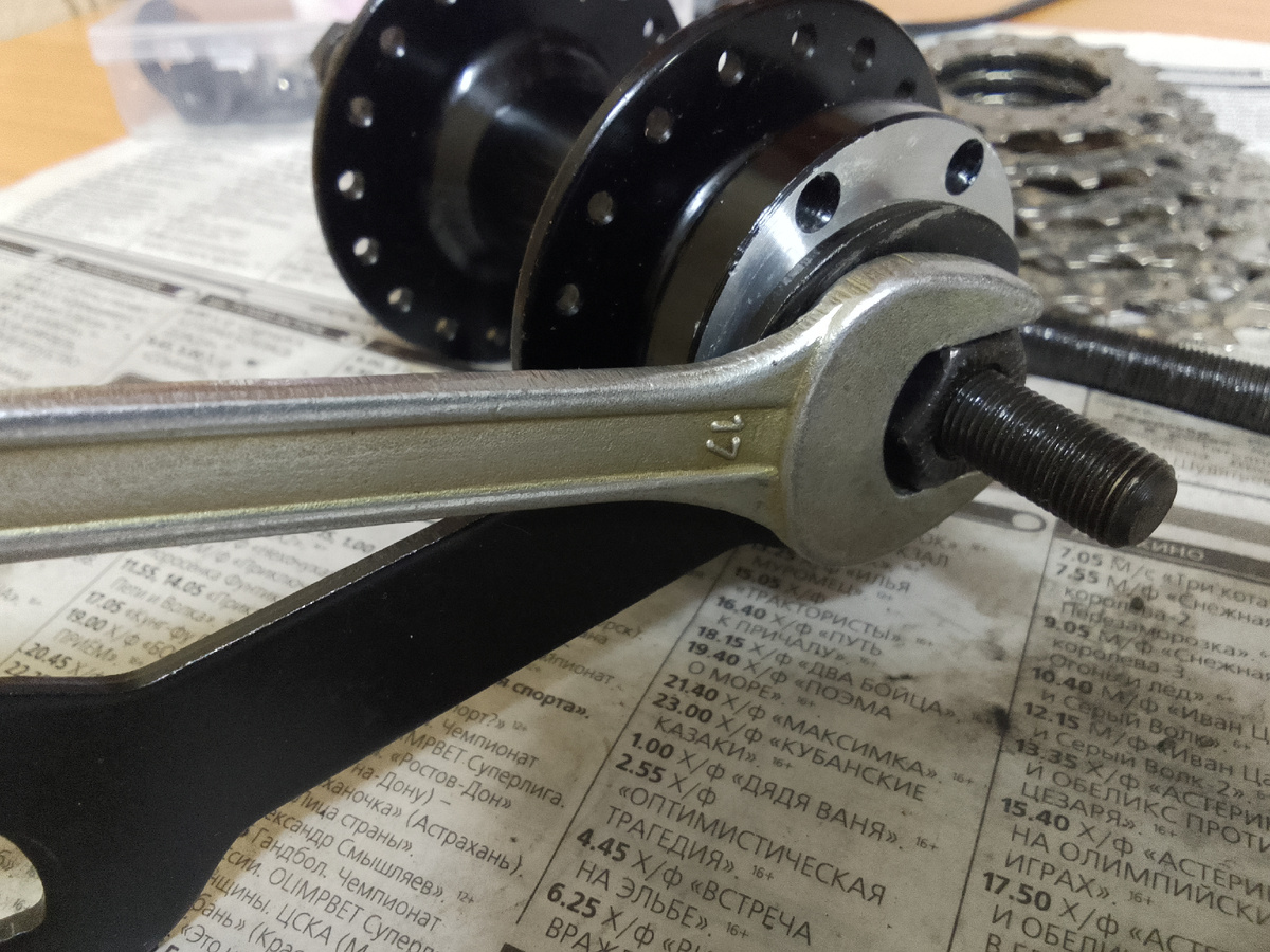 2 ключа, на 15 и на 17, раскрутить левую контргайку на оси (не со стороны трещотки), отрегулировать конус для легкого вращения колеса, обратно затянуть контргайку.