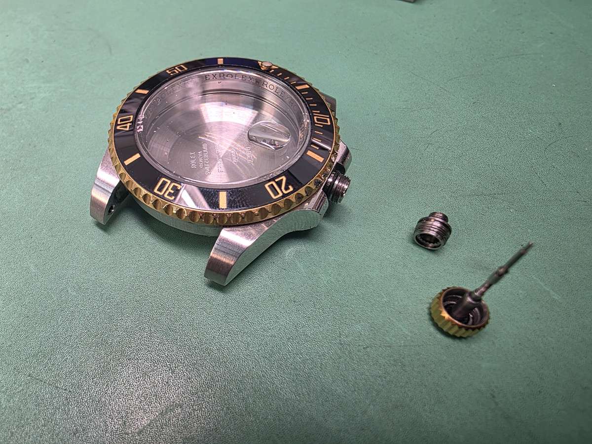 Пришли часы с поврежденной резьбой заводной головки. Был изготовлен новый футер и нарезанна резьба. Буду периодически выкладывать наши работы.