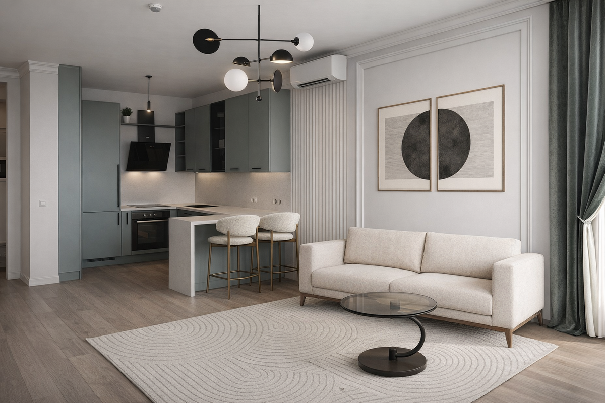 Когда кухня уже куплена, а ощущение дома так и не появилось — решение часто кроется не в ремонте, а в нюансах. Квартиры от застройщика почти всегда выглядят одинаково: аккуратные, нейтральные, без характера. Кухня куплена, всё на своих местах, но ощущение дома так и не появляется. В ожиданиях была тёплая кухня-гостиная, пространство, в котором хочется задержаться, а в реальности — функциональный, но эмоционально пустой интерьер. Задача этого проекта заключалась не в переделке кухни, а в более тонкой работе — добавить уюта и собрать пространство в единое целое, деликатно вписав уже существующую кухню в общую композицию. Сложность была в том, что сама кухня изначально не поддерживала выбранную концепцию интерьера и визуально спорила с остальной частью квартиры. Решение нашлось не в радикальных шагах, а в нюансах. Появились тактильные текстуры, округлые формы в мебели, спокойные акценты в деталях. В одном варианте пространство смягчает круглый ковёр и небольшой акцентный столик у дивана,
