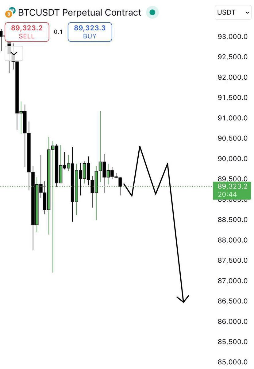 Вчерашний сквиз до $91k сменился коррекцией обратно к $89k, где сейчас и торгуемся. На выходных — тишина, как обычно. Ждём начала недели и продолжения коррекции через возможные короткие отскоки в рамке $89-90к. #Bitcoin #BTC #Анализ #альтсезон BusineesEconomyBlockchain l Bybit