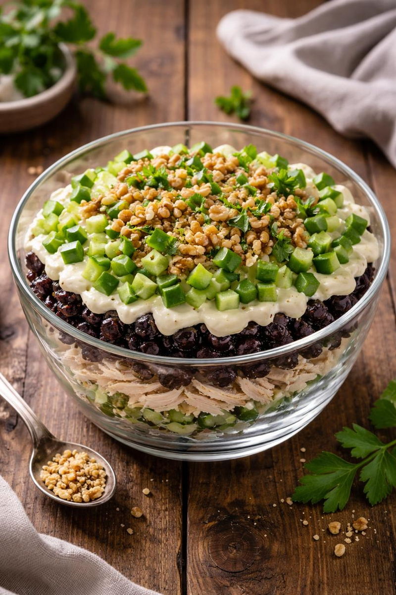 Этот салат не требует сложного сопровождения. Достаточно свежего белого хлеба или легких овощных нарезок. Его сила — в самодостаточности. Каждая ложка, где одновременно чувствуется нежность курицы, сладость чернослива, свежий хруст огурца и пикантность орехов, — это маленький шедевр компромисса.