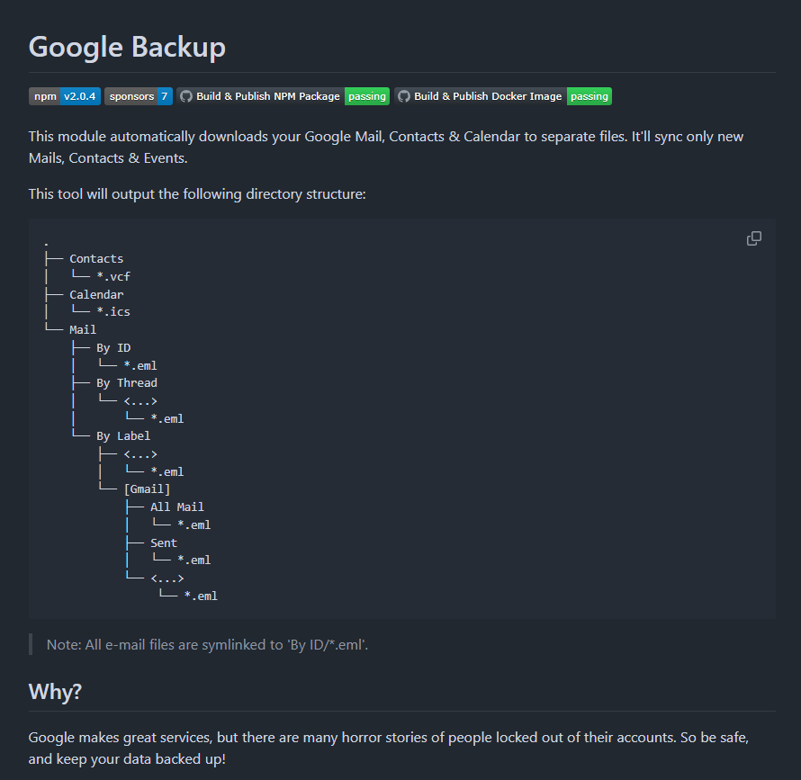 node-google-backup — это эффективная утилита командной строки (CLI), написанная на JavaScript, которая позволяет автоматизировать процесс создания локальных копий ваших данных из ключевых сервисов Google: Почты, Календаря и Контактов. Это идеальное решение для тех, кто хочет иметь полный контроль над своей информацией без привязки исключительно к облачному хранилищу. * Синхронизация новых данных: Утилита работает по инкрементальному принципу — она загружает только новые письма, контакты и события календаря, что существенно экономит трафик и дисковое пространство. * Автоматизация через Cron: Благодаря формату CLI, процесс резервного копирования легко планируется через стандартные планировщики задач (например, crontab), превращая его в полностью автономный процесс. * Поддержка Docker: Приложение можно запустить в контейнере, что упрощает развертывание на серверах или NAS (Synology, QNAP) без необходимости ручной настройки среды Node.js. * Структурированное хранение: Все данные сохраняютс