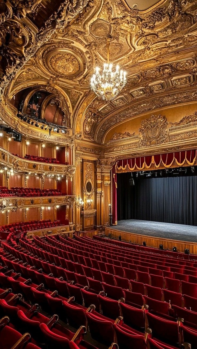 Перед вами — не просто зрительный зал, а портал в мир искусства, где каждая деталь дышит историей и роскошью. Величественный зал оперного театра словно приглашает окунуться в эпоху балов и королевских приёмов. Золото лепнины, изысканные узоры на потолке, роскошная люстра, сверкающая, как звёздное небо, — всё здесь создано для того, чтобы захватывать дух.