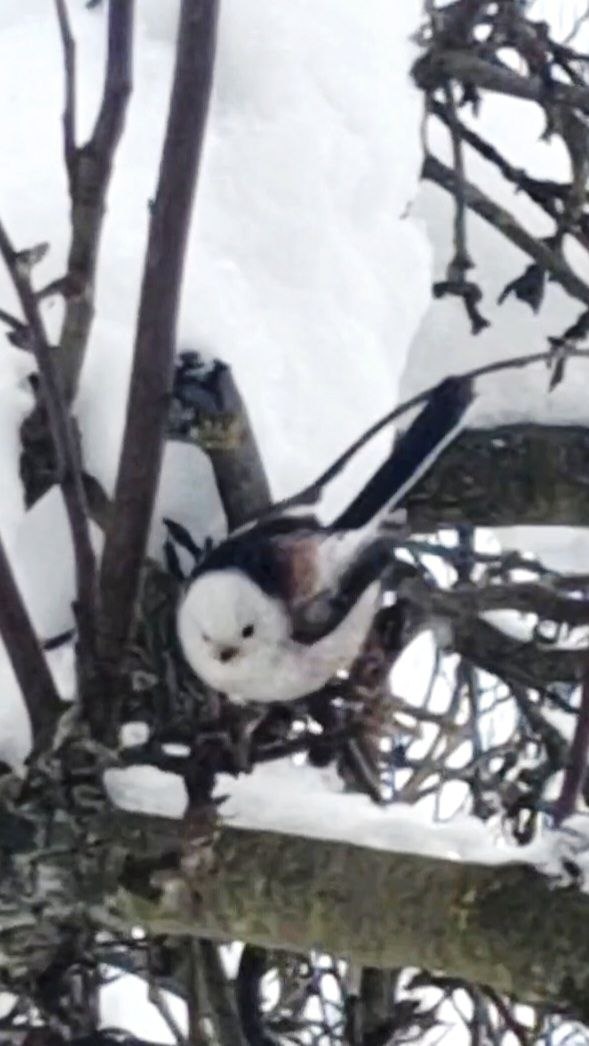 Пополнила список птиц, столующихся у нас на кормушке, двумя новыми видами. Второй день нас посещает стайка длиннохвостых синиц. Это такие маленькие, очаровательные, очень суетливые и непоседливые пушистые комочки. Они действительно похожи на синичек, но относятся к отряду воробьинообразных. У длиннохвостых синиц много других названий: ополовник, фазанчик, павлинчик, хвостовка, виноградка, чимичка. Название ополовник они получили за то, что напоминают половник с длинной ручкой. Ополовники — одни из самых мелких птиц, их вес не превышает 9 -11 грамм, совсем крохи. Занесены в Красную книгу Москвы как редкий вид.