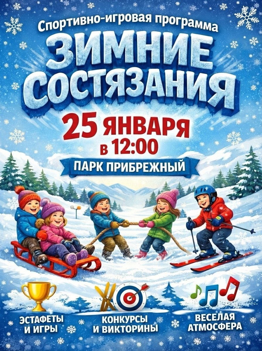 25 января в 12:00 в парке "Прибрежный" взрослые и дети смогут принять участие в веселой спортивной программе на свежем воздухе.