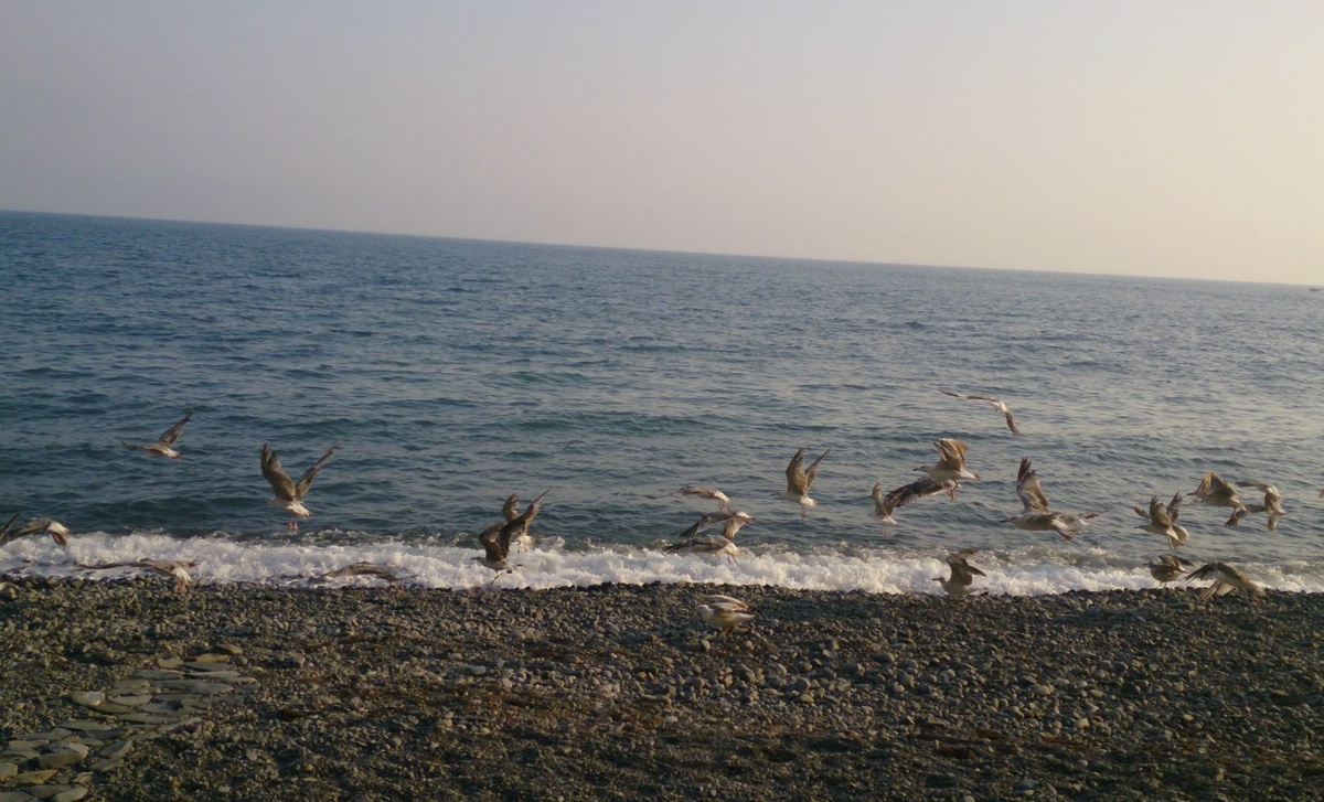 Берег между Макопсе и Магри весь такой вытянутый, галька в основном, без резких обрывов, но местами встречаются насыпи из больших камней, особенно ближе к устью реки. Мы там посидели минут 15, ели орехи и смотрели, как местный дед ловит мелочь в такую сетку, у него на голове была бейсболка с надписью «Краснодар 2011». Он нам потом сказал, что это устье раз в несколько лет вообще пересыхает полностью, а потом снова набирается. Вода прозрачная, видно было крабиков, маленьких таких, как пуговицы.