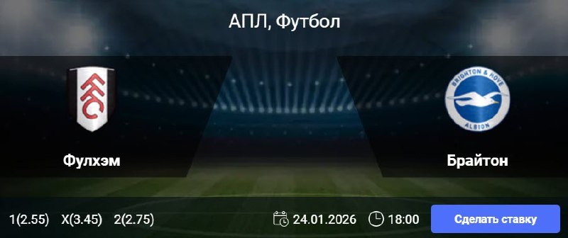 Статистика Фулхэма: В семи из десяти последних матчей «Фулхэма» в чемпионате обе команды забивали. В четырех из пяти последних домашних игр «дачников» в Премьер-лиге было забито не менее трех мячей. В восьми из одиннадцати предыдущих домашних встреч в АПЛ лондонцы не проигрывали, одержав шесть побед и дважды сыграв вничью. Статистика Брайтона: «Брайтон» одержал лишь одну победу в последних девяти матчах АПЛ, пять раз сыграв вничью и трижды уступив. В шести из восьми предыдущих игр с участием «чаек» в чемпионате было забито не более двух голов. «Брайтон» не проигрывает во вторых таймах на протяжении шести матчей Премьер-лиги подряд (четыре победы, две ничьи). 🎯 Фора 1 (0) 🎲 кф (1.84) 👉 СДЕЛАТЬ СТАВКУ 🎁 ФРИБЕТ WINLINE - 3000₽ (промокод: BETWIN) 👉 СМОТРЕТЬ ПРОГНОЗ 👇 Подпишись на нас 🧿 ВКонтакте ✈️ Телеграм 📎 Сайт