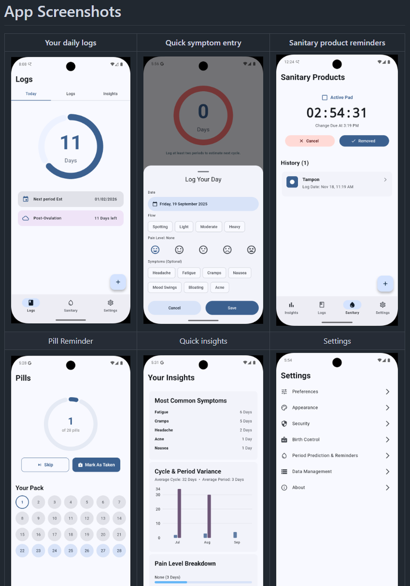 Menstrudel — это бесплатное, полностью автономное приложение с открытым исходным кодом, предназначенное для отслеживания менструального цикла и приема контрацептивов. Оно предоставляет пользователям полный контроль над своими данными, исключая облачную синхронизацию и регистрацию аккаунтов. * Умное отслеживание цикла: Позволяет фиксировать даты начала менструации, интенсивность выделений, уровень боли и специфические симптомы. * Прогноз и аналитика: Предоставление прогнозов на следующие циклы на основе личной истории и расчет среднего окна фертильности. * Управление контрацепцией: Гибкая настройка напоминаний о приеме таблеток (режимы 21/7, 28 дней и другие) и поддержка LARC (длительно действующих методов, таких как ИМК или спирали) с уведомлениями о датах обновления. * Полная автономность: Все данные хранятся исключительно на устройстве пользователя в базе данных SQLite; приложение работает без подключения к интернету. * Биометрическая защита: Возможность блокировки доступа к приложен