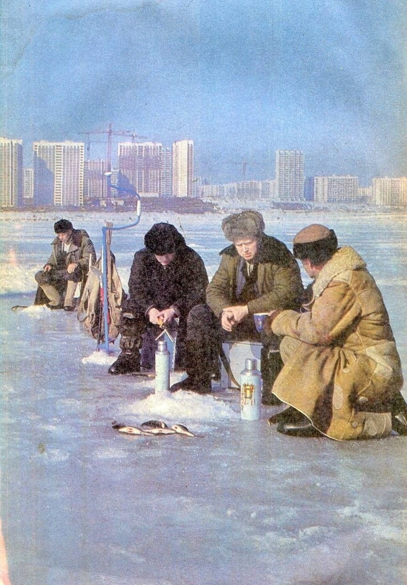 Этот снимок словно переносит нас в прошлое — в атмосферу спокойных зимних дней, когда рыбалка была не просто хобби, а целым ритуалом, объединяющим друзей и семьи. На фоне строящегося города четверо рыбаков погружены в своё неспешное занятие: они сидят на льду, укутанные в тёплые тулупы и ушанки, сосредоточенно следят за лунками и бережно обращаются с уловом.