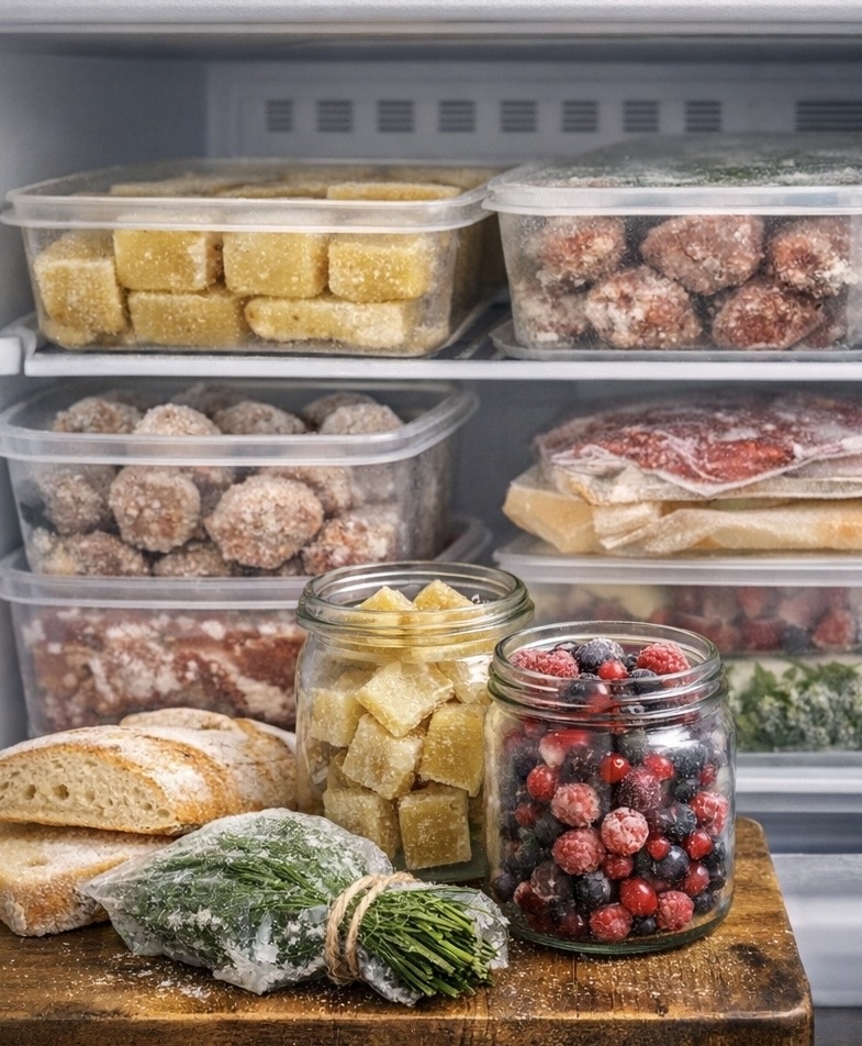 В 2026 году морозилка — не просто отсек холодильника, а настоящий "план Б" для занятых дней. Многие хозяйки превращают её в стратегический запас: продукты, замороженные правильно, сохраняют вкус и пользу месяцами. Диетологи подтверждают: домашние заготовки полезнее магазинных (меньше соли, консервантов). Вот шесть вещей, которые эксперты рекомендуют держать в морозилке всегда. Куриный, говяжий или овощной бульон в порционных контейнерах/кубиках — золото. Разморозил — и суп, ризотто или соус готов за минуты. В 2026-м тренд: костный бульон (коллаген для суставов/кожи). Варят 12–24 часа в мультиварке, замораживают. Малина, черника, вишня, смородина — замороженные сохраняют 90% витаминов (исследования USDA). Для смузи, компота, выпечки, морса. Совет: замораживать россыпью на подносе — не слипаются. Хорошее масло (82,5% жирности) хранится в морозилке год. Замороженное — идеально тереть в тесто (песочное печенье хрустит лучше). В 2026-м популярно топлёное (гхи) — не горит, долго хранится. На