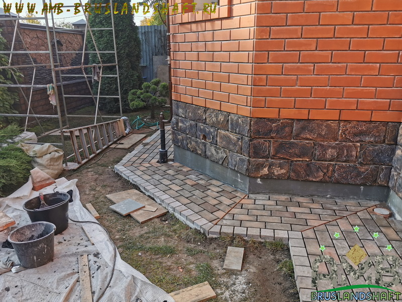Отмостка на углу дома поворот брусчаткой Поворот брусчатки на отмостке угла дома, примыкание Правильный поворот тротуарной брусчаткой на углу отмостки Повороты мощения на отмостках дома Как правильно повернуть брусчаткой на углу дома омостки Угол примыкания брусчатки к зданию для нас вопрос совсем некорректный и более того, непонятный. Если речь идет об отмостке на углу дома и уложенной на ней брусчатке, то в таком случаем мы вам подскажем 3 поворота брусчаткой, которые можно исполнить одной и той же раскладкой. Но прежде чем изготавливать отмостку из бетонного основания под брусчатку, не вздумайте делать термошов на углу дома бетонной отмостки. Если делать швы разрывы на углах дома основания отмосток, то углы могут деформироваться, потрескаться, полопаться, особенно на сужениях угла бетона. На углах отмосток можно сделать много поворотов мощения, которые мы покажем вам на примере профессиональных работ по укладке брусчатки по технологии AMB-bruslandshaft. Поворот классический с раз