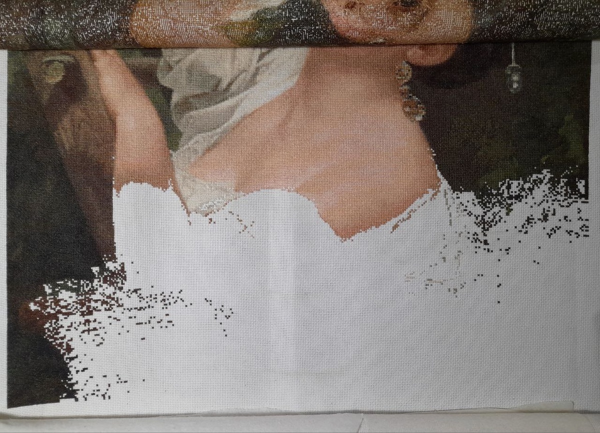 Итак, последняя перемотка произведена. Перед вами весь незашитый участок. Нижний левый угол уже есть. Правда его немного перекосило - канва неровно натянута. Осталось добраться до правого...))) До финиша всего-то 24% - это примерно 32500х. Из всего, что осталось самым сложным будет вышить корзину, там очень много одиночных крестиков на расстоянии друг от друга. И хочу уже "выводить значки" из работы. Т.е. вышивать их полностью, так как вся зона отшива открыта. Взяла курс на финиш...)))