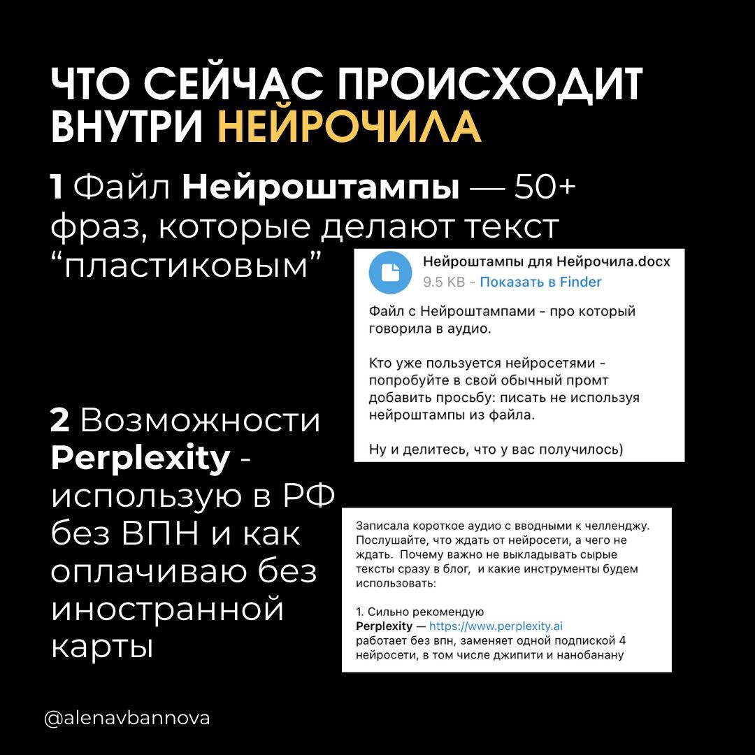 ! Не спорю, но вот что сейчас уже происходит внутри Нейрочила: 1 Участники забрали файл Нейроштампы. Это 50+ фраз, которые гпт и дипсик подсовывают в каждый текст. Удаляешь их и посты начинают звучать живее. 2 Делюсь, какой нейросетью сейчас пользуюсь вместо gpt, claude и нано-бананы. И нет, это не боты в телеграм, а нейросеть, которая работает в РФ без впн и помогает мне экономить на дизайнерах, копирайтерах и фотографах. Рассказываю как оплачиваю без иностранных карт с номера мобильного телефона. 3 Участники уже знакомятся в чате и самые активные получают не только мои инструкции, но и новых подписчиков в свои каналы 4 Плавно готовимся к старту: собираем фактуру, чтобы научить нейросеть писать своим голосом, а не шаблонами. Для новеньких, кто меня видит первый день. И пока не доверяет и думает - опять воды нальют и будут только платные продукты втюхивать Почитать больше 150 отзывов о моих бесплатных движухах можно тут, тут и тут. Ну а если вы поняли, что вам это надо - зах