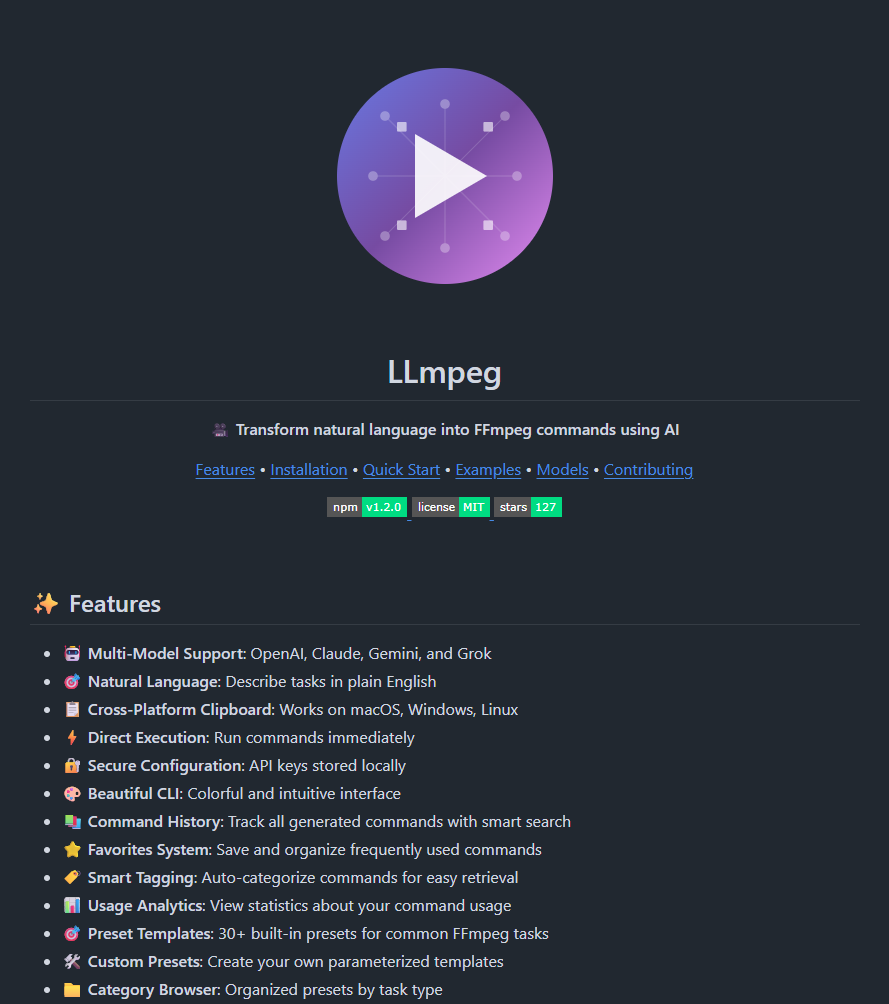 llmpeg — это инновационный инструмент с открытым исходным кодом, который использует возможности больших языковых моделей (LLM) для перевода текстовых описаний задач по обработке мультимедиа в готовые к исполнению команды FFmpeg. Это позволяет пользователям выполнять сложные операции с видео и аудио, не заучивая специфический синтаксис и многочисленные флаги FFmpeg. * Интерфейс на естественном языке: Позволяет описывать такие задачи, как обрезка, изменение размера, конвертация форматов или наложение фильтров, простыми словами. * Поддержка TypeScript: Проект реализован на языке TypeScript, что обеспечивает надежность кода и удобство для разработчиков. * Интеграция с LLM: По умолчанию инструмент может взаимодействовать с API OpenAI для генерации точных команд на основе контекста пользователя. * Кроссплатформенность: Благодаря использованию среды выполнения Node.js, инструмент может работать в различных операционных системах, где установлен FFmpeg. * Гибкая настройка: Возможность использов