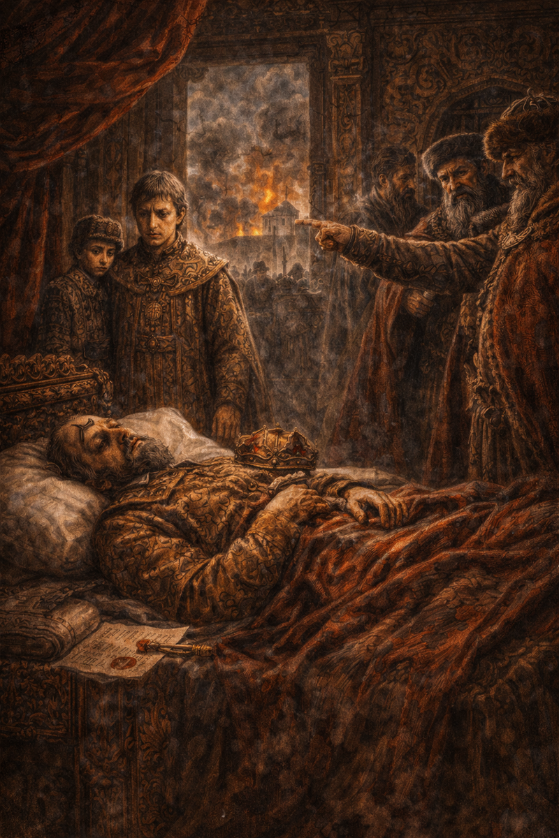 К моменту внезапной смерти Ивана IV в марте 1584 года Русское государство находилось в состоянии глубокого системного кризиса, ставшего итогом десятилетий опричного террора и изнурительной Ливонской войны. Экономическое запустение земель сопровождалось дезориентацией элит и опасным административным дуализмом: страна оставалась фактически расколотой на «особый двор» и «земщину». Геополитическое поражение было закреплено утратой не только завоеваний в Прибалтике, но и исконных новгородских территорий — Яма, Копорья и Ивангорода.