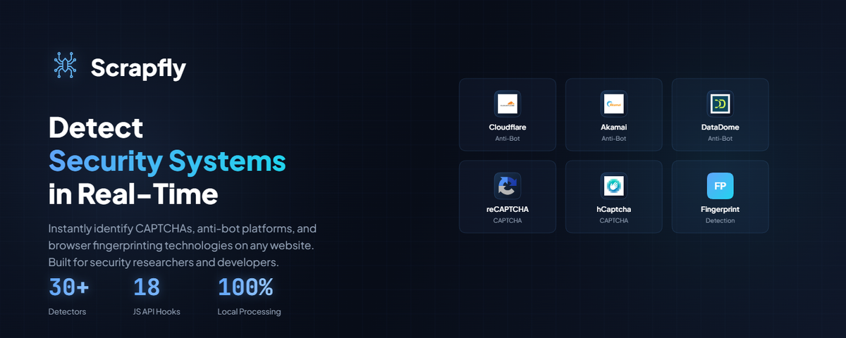 Antibot-Detector — это продвинутое расширение для браузера, разработанное для идентификации систем защиты от ботов, CAPTCHA-сервисов и механизмов веб-безопасности в режиме реального времени. Инструмент незаменим для веб-разработчиков, исследователей безопасности и специалистов по скрапингу данных. * Многоуровневое обнаружение: Использует четыре взаимодополняющих метода анализа — проверку DOM-дерева, мониторинг сетевых запросов, инспекцию свойств окна (window) и перехват JavaScript API. * Идентификация 26+ технологий: Автоматически распознает такие системы, как Cloudflare, DataDome, PerimeterX (HUMAN), Akamai, Akamai Bot Manager, Shape Security, AWS WAF, Imperva и Kasada. * Детекция CAPTCHA: Определяет наличие и типы сервисов reCAPTCHA (v2/v3), hCaptcha, FunCaptcha (Arkose Labs), GeeTest и Cloudflare Turnstile. * Анализ фингерпринтинга: Выявляет попытки отслеживания через Canvas, WebGL, Audio, Font и WebRTC, которые используются для уникальной идентификации браузера. * Оценка уверенност