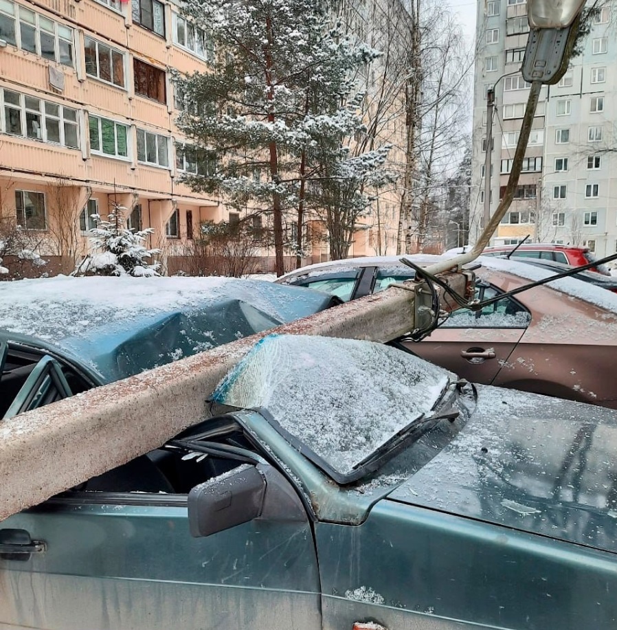 Фонарный столб упал на автомобиль при уборке снега в Ленинградской области
