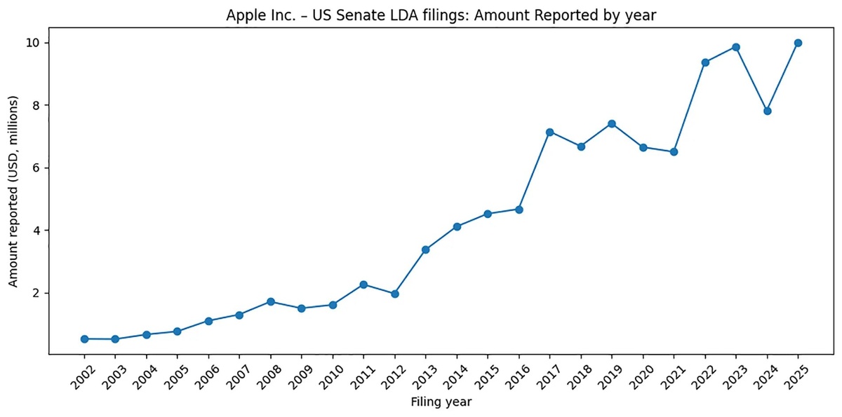 Apple потратила ровно 10 миллионов долларов на федеральное лобби в 2025 году, установив личный рекорд компании, сообщает Bloomberg. Это на 27,9% больше, чем годом ранее, причем расходы росли каждый квартал — от 2,45 миллиона долларов в первом до 2,73 миллиона в четвертом. Особенно активно Купертино работало в последние три месяца года, когда на повестке оказался самый широкий спектр вопросов: от конкуренции в магазинах приложений до искусственного интеллекта, производства полупроводников и иммиграционной политики. Для тех, кто не в курсе: лоббизм в США — это абсолютно легальная деятельность, при которой компании нанимают специальных представителей для общения с законодателями и чиновниками. Эти люди объясняют позицию бизнеса по тем или иным законопроектам, предоставляют экспертизу и пытаются убедить власти принять выгодные решения. Никаких взяток и коррупции — все прозрачно, с обязательной отчетностью перед Сенатом. По сути, это профессиональное влияние на политику через аргументы, а
