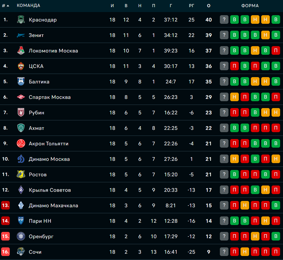 На первый взгляд кажется, что всё логично - Краснодар впереди с 40 очками, Зенит ввязался с 39, Локомотив дышит в спину с 37. Ни одна из этих команд не должна быть ниже. Но если присмотреться внимательнее, то первые 18 туров РПЛ этого сезона получились куда более интересными, чем кажется с виду.