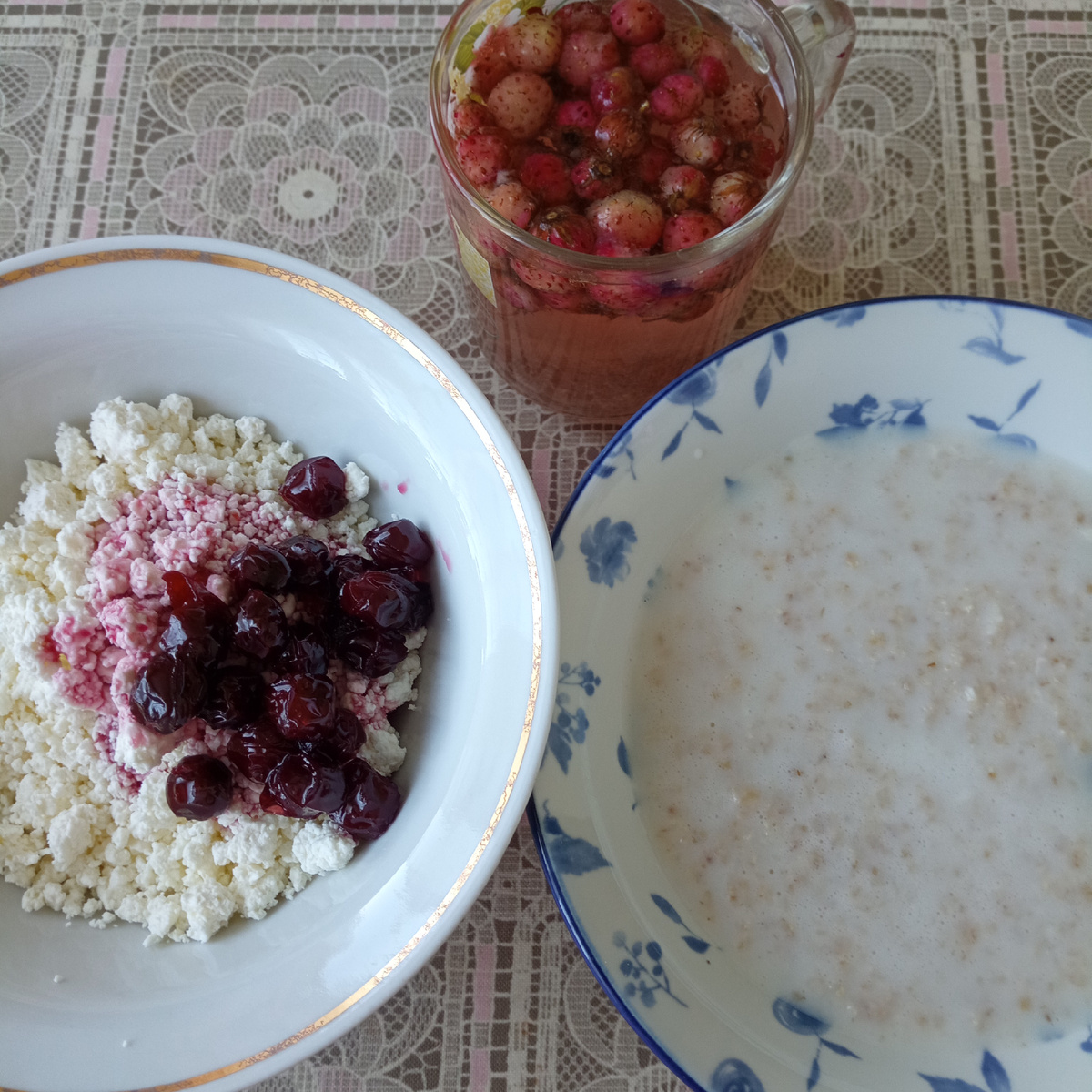 На завтрак каша и творог с вишнёвым вареньем. Варенье с косточкой. Я никогда её не вынимаю, мне так проще варить. Рот быстрее справляется с освобождением от косточек)). Заварила полевую клубнику. Аромат лета, м-м-м!