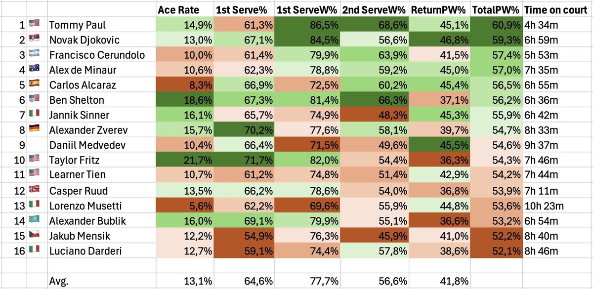 : Key Statistics: 4-й круг ATP 📊 Кто из теннисистов выдал лучшие цифры на турнире? Собрали статистику по ключевым показателям. Tommy Paul Novak Djokovic Francisco Cerundolo Alex de Minaur Carlos Alcaraz Ben Shelton Jannik Sinner Alexander Zverev Daniil Medvedev Taylor Fritz Learner Tien Casper Ruud Lorenzo Musetti Alexander Bublik Jakub Mensik Luciano Darderi 📊 Средние показатели: • Ace Rate: 14,9% — 10,0% • 1st Serve %: 61,3% — 69,1% • 1st Serve Win %: 79,9% — 72,5% • 2nd Serve Win %: 56,6% — 41,5% • Return Points Won %: 45,1% — 37,1% • Total Points Won %: 63,9% — 54,2% • Time on court: от 4ч 34м до 10ч 23м Самый долгий матч у Learner Tien (10ч 23м), а лучший процент выигранных очков — у Carlos Alcaraz (63,9%). Подпишись на Эйс и точка
